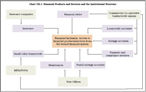 7.14 The operational definition of financial inclusion, based on the access to financial products or services, also underscores the role of financial institutions or service providers involved in the process. The anatomy of various financial products or services and the institutional structure is schematically presented in Chart VII.1.