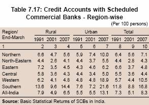7.110 The region-wise pattern indicates that savings accounts per 100 persons declined between 1991 and 2001 in all the regions, barring North-Eastern and Central regions in which the number of savings accounts per 100 persons increased. This pattern was observed broadly in both the rural and urban areas. However, savings account penetration increased sharply between 2001 and 2007 in both the rural and urban areas in all the regions (Table 7.27). The access to savings accounts was more evenly spread in comparison with credit accounts. Credit accounts showed a greater concentration in the Southern region, while savings accounts were more or less evenly spread in the Northern, Southern and Western regions. However, penetration of both savings accounts and credit accounts was low in the NorthEastern, Eastern and Central regions.