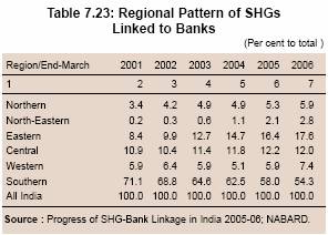 7.48 To further promote the SHG-bank linkage programme in the country, banks were advised in 1998 that SHGs that were engaged in promoting the saving habits among their members would be eligible to open savings bank accounts and that such SHGs need not necessarily have availed of credit facilities from banks before opening savings bank accounts. Subsequent to the Monetary and Credit Policy announcement for the year 1999-2000, banks were