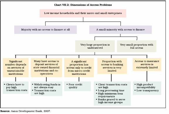 7.24 Measuring an individual’s or household’s usage of a particular financial service at a given time may not reveal whether exclusion is short-term or the result of a long-term process, nor whether access is diminishing or improving (Chant Link and Associates, 2004). Thus, financial exclusion is perceived as an ongoing process in terms of vulnerability to exclusion, rather than simply having access to certain financial services or not. In particular, financial exclusion may be a long-term phenomenon for many consumers or even a life-long process (Connolly and Hajaj, 2001). For families with particular constellations of socioeconomic characteristics, it may extend beyond the lifetime of an individual family member and become inter-generational. It has generally been recognised that it is the poorer sections of the population that do not have access to financial services - formal or informal. However, in many countries, many non-poor individuals, micro, small and medium entrepreneurs also have difficulty in accessing financial services. The most conspicuous dimension is that many of the low-income segments of the population do not have access to even the very basic financial services. Even amongst those who have access to finance, most are underserved in terms of quality and quantity of products and services and significant proportion of low-income households is dependent on unsustainable, subsidy-dependent and poorly performing institutions (Chart VII.2).