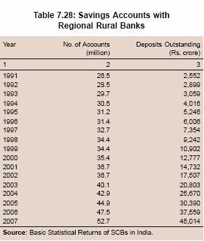 7.111 The number of savings accounts with RRBs, which are included in scheduled commercial banks data in Table 7.27, increased significantly between 1991 and 2006. In tandem with the growth in the number of accounts, the deposits with RRBs also increased (Table 7.28).