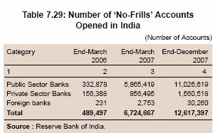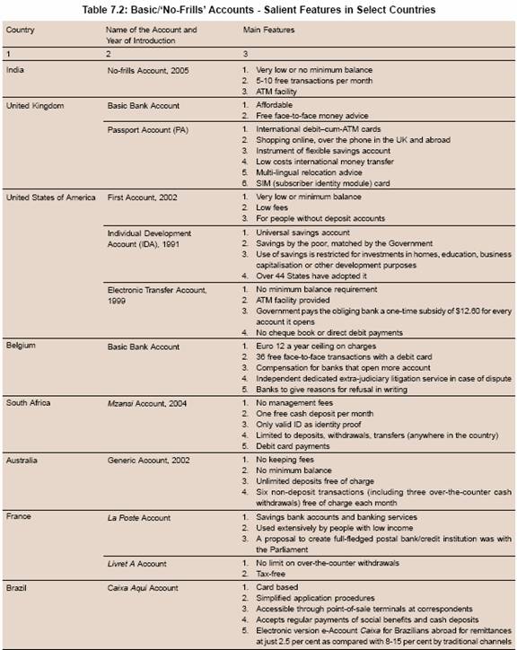 7.50 The process of financial inclusion received further impetus in November 2005, when banks were advised to make available a basic banking ‘no-frills’ account with low or nil minimum balances as well as charges to expand the outreach of such accounts to vast sections of the population. The low cost or free of cost account is internationally considered to be helpful in expanding the access of banking services, particularly to the low income groups. Similar types of accounts, though with different names, have also been extended by banks in various other countries with a view to making financial services accessible to the common man either at the behest of banks themselves or the respective Governments (Table 7.2).