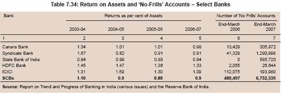 7.131 While operating costs of ‘no-frills’ accounts could appear to be high, an analysis of operations in totality for some banks suggests that they can open a large number of ‘no frills’ accounts and still maintain their performance level. For instance, Syndicate Bank opened the largest number of ‘no frills’ accounts (1.25 million) in 2006-07 - the largest by any single bank in a single year. As a result, Syndicate Bank constituted the largest share in ‘no frills’ accounts by the banking industry at end-March 2007. The opening of a large number of ‘no-frills’ accounts in a single year, however, did not appear to have affected the financials of the Syndicate Bank as it was able to maintain its return on assets (RoA) (Table 7.34). It is true that RoA is influenced by several factors, nevertheless, the Syndicate Bank case suggests that the opening of ‘no-frills’ accounts may not be a loss-making proposition. In this context, it may also be noted that the average deposit size in the ‘no frills’ accounts increased in recent years. This trend of increase in average deposit size is expected to gain further momentum in view of high economic growth. Furthermore, extending banking services to lower income groups would trigger a virtuous cycle whereby access to banking services would enable more equitable distribution of the benefits of high economic growth, resulting in improvement in the level of income of the lower income groups. This will lead to increase in average deposit size in the accounts opened by the lower income groups, thereby making financial inclusion an operationally profitable and sustainable business proposition for banks. Moreover, as the economy grows and income growth takes place, today’s ‘no frills’ accounts can be expected to assume the normal account status over the years.