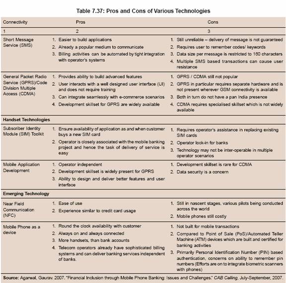 7.136 Mobile phone-based services are revolutionising micro-finance services in a number of countries (Asian Development Bank, 2007). Mobile banking (or mobile payment) is a term used for performing balance checks, account transactions, payments, etc. via a mobile device such as a mobile phone, PDA or other such device. Most of the mobile payment platforms fall into four categories: (i) mobile banking enabling users to perform banking transactions using mobile phone like, balance checks, fund transfers, bill payments;(ii) remote purchase; (iii) person to person transfers; and (iv) point of sale, i.e., using phones to pay for goods at merchant location. These services can be provided using various available connectivity technologies, each one of which has its own pros and cons (Table 7.37). However, the extent to which technology will be integrated into the financial service industry at the low end will depend on supportive government policies and the quality of the infrastructure, particularly in rural areas.