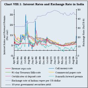 8.33 The Uncovered Interest Rate Parity (UIP) implies that ex-ante, expected home currency returns on foreign bonds or deposits in excess of domestic deposits of equal maturity and default risk should be zero. The currency composition of the asset holdings is, therefore, irrelevant in determining relative returns. The prevalence of UIP also implies that the cost of financing for domestic firms in domestic and foreign markets would be the same. Operating through rational expectations, the UIP suggests that expected changes in the nominal exchange rates should approximate the interest rate differentials. In the Indian context, though empirical studies confirm the existence of CIP, they dispute the existence of UIP. Usually, if CIP holds, UIP will also hold if investors are risk-neutral and form their expectations rationally, so that expected depreciation of home currency equals the forward discount (Box VIII.4). 8.34 As alluded to earlier, the equity market has relatively low and negative correlation with other market segments (Table 8.2). The low correlation of the equity market with risk free instruments is indicative of greater volatility of stock returns and the existence of large equity risk premium. The large risk premium occurs when equity price movements cannot be rationalised with standard inter-temporal optimisation models of macroeconomic fundamentals such as consumption and savings (Mehra and Prescott, 1985). This could be on account of different participants in the equity and other financial markets. For instance, the common participation by banks in the money, the government, the foreign exchange and the credit markets ensures fairly high correlation among these segments. The exposure of banks to the capital market remains limited on account of restrictions due to prudential regulation. A major reason for the surge in equity prices could be due to demand-supply mismatches for equity securities. In fact, a large proportion of equities is held by promoters and institutional investors as detailed in Chapter VII. The supply of securities for retail investors could possibly be lagging behind their demand. Equity prices, however, have relatively higher correlation with the forward exchange rate than other market interest rates. This is because portfolio investors, mainly, the FIIs, are allowed to hedge their exposure in the foreign exchange market through the forward market. 8.37 Developed and integrated financial markets are pre-requisites for effective and credible transmission of monetary policy impulses. The success of a monetary policy transmission framework that relies on indirect instruments of monetary management such as interest rates is contingent upon the extent and speed with which changes in the central bank’s policy rate are transmitted to the spectrum of market interest rates and exchange rate in the economy and onward to the real sector (Mohan, 2007). Deviations between money market rates and the policy interest rate, in particular, have at least two adverse effects. First, they weaken the monetary policy transmission mechanism and introduce an element of uncertainty. Greater the influence the central bank has over interest rate levels, the easier it is for it to manage demand in the economy and attain its objective of low inflation and sustained growth (Petursson, 2001). Second, a large spread entailing a mismatch between inter-bank rates and the central bank’s policy rate could lead to inefficiencies in the financial intermediation process. In the Indian context, there has been convergence among market segments, with a significant decline in the spread of market interest rates over the reverse repo rate (Table 8.4). The spread was the lowest for the inter-bank call money rate followed by rates on Treasury Bills, certificates of deposit, commercial paper and 10-year government bond yield. The benefit of financial markets development percolating to the private sector was also evident from the moderation in spread of commercial paper over the policy rate. The narrowing of the spread between the policy rate and other market rates suggests the increasing efficiency of the transmission mechanism of monetary policy. 8.38 Besides correlation measure, more formal and robust approach to market integration analysis entails an investigation of causal relationship among various interest rates. The causal relationship between reverse repo rate and market interest rates, in particular, highlights the importance of monetary transmission in influencing the term structure of interest rates. Empirical analysis of Granger causality reveals certain important features of transmission mechanism in the Indian context5. First, lags associated with the transmission of policy impulses to market rates are aligned with the term structure of instruments; short-term rates exhibit relatively lower lags than medium and longer maturity instruments to the changes in policy rates. Second, the reverse repo rate has uni-directional causal effect on short-end of the financial market, including call money rate and 91-day Treasury Bills rate. In the medium-to-longer term horizon, 10-year Government bond yield has a bi-directional causal association with the reverse repo rate. This could be attributed to the feedback between policies and markets, since at the longer end, financial markets contain useful information about investment activity and economic agents’ expectations about inflation and growth prospects. Box VIII.4 In the context of a country’s international financial integration, an important issue is the degree of foreign exchange market efficiency, which can be examined through empirical evaluation of ‘covered interest parity (CIP)’ and ‘uncovered parity (UIP)’ hypotheses. The interest parity hypothesis is important from a policy perspective (Blinder, 2004). First, the CIP reflects information efficiency of the foreign exchange market. Deviations from CIP can arise because of imp