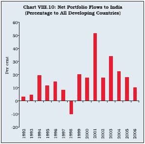 1990-91). Since 2004-05, China has emerged as the third major export destination for India after the US and the UAE. China has now become the largest source of imports for India, relegating the US to the second position. India’s exports to China surged to 7.4 per cent of India’s total non-oil exports (0.3 per cent in 1991-92). Similarly, India’s imports from China accounted for 10.3 per cent of India’s total non-oil imports, a sharp increase from 0.2 per cent in 1991-92. This reflects growing trade relations between the two countries. A similar trend was noticeable vis-à-vis the ASEAN-5 (Singapore, Thailand, Malaysia, Indonesia and the Philippines). In recognition of the growing importance of Asian countries in India’s foreign trade, a series of nominal and real effective exchange rate indices released by the Reserve Bank were revised a couple of years ago to include Chinese renminbi and Hong Kong dollar in the weighting scheme. With Japan already a part of the indices, the representation of Asian economies has increased to three in the six-country real effective exchange rate index. There has been an ongoing transformation in the composition of production and trade as the comparative advantage of many Asian economies continues to change in an environment of growing regional co-operation (Box VIII.5). In particular, economies with relatively high wage costs are shifting towards higher value-added products, including services. 8.52 In tandem with trade openness, India’s capital account has witnessed a structural transformation since the early 1990s, with a shift in the composition from official flows to market-oriented private sector flows (Table 8.12). After independence, during the first three decades, trade balance was financed by capital account balance comprising mainly the official flows. During the 1980s, the dependence on official flows moderated sharply with private debt flows in the form of external commercial borrowing and non-resident Indian (NRI) deposits emerging as the key components of the capital account. 8.53 Following the shift in emphasis from debt to non-debt flows in the reform period, foreign investment comprising direct investment and portfolio flows emerged as predominant component of capital account. India’s FDI openness, as measured by FDI stock to GDP ratio, increased ten-fold from 0.5 per cent in 1990 to 5.8 per cent in 2005. However, this is still much lower than other emerging countries in Asia, including China (Table 8.13). Box VIII.5 After the South East Asian crisis of 1997, the geographic scope of cooperation initiatives is expanding across sub-regions of Asia. East Asian economies have embarked on various initiatives for regional monetary and financial cooperation. The major initiatives for regional cooperation in Asia include ASEAN+3, Chiang Mai Initiative, Executives’ Meeting of East Asia- Pacific Central Banks (EMEAP), Asian Bond Market Initiative and Asian Bond Fund. The countries of ASEAN –Brunei Darussalam, Cambodia, Indonesia, Laos, Malaysia, Myanmar, the Philippines, Singapore, Thailand and Vietnam –and India have entered into a Framework Agreement on comprehensive economic cooperation. The ASEAN has embarked on a process to expand economic cooperation with its neighbours in the north, namely China, Japan and South Korea (ASEAN+3). As far as India’s association with ASEAN community is concerned, currently India is not a full-fledged part of the ASEAN network but holds a regular summit with the ASEAN. However, in the years ahead, it is envisaged that ASEAN+3+3 network1 would help India to share and cooperate on various financial issues as the present network of ASEAN+3 has been consistently engaging in economic policy dialogue of unprecedented scope and depth. Another instance of central banking cooperation in Asia exists in the form of reciprocal currency or swap arrangements under the Chiang Mai Initiative2 . The ASEAN Swap Arrangement (ASA) was created primarily to provide liquidity support to countries experiencing balance of payments difficulties. The Finance Ministers of ASEAN+3 announced this initiative in May 2000 with the intention to cooperate in four major areas, viz., monitoring capital flows, regional surveillance, swap networks and training personnel. A more explicit central banking cooperation has been existing in the form of EMEAP since 19913. The ongoing work of EMEAP seeks to further strengthen policy analysis and advice within the region and encourage co-operation with respect to operational and institutional central banking issues. EMEAP central banks have actively coordinated on issues relating to financial markets, banking supervision and payment and settlement systems. The Asian Bond Fund (ABF) initiative of the EMEAP Group has been one of the major initiatives aimed at broadening and deepening the domestic and regional bond markets in Asia. The initiative has been in the form of ABF1 and ABF2. In the near term, the ABF2 Initiative is expected to help raise investor awareness and interest in Asian bonds by providing innovative, low-cost and efficient products in the form of passively managed bond funds. More and more similar kinds of index-driven private bond funds are rapidly emerging in Asia. At present, India does not contribute in the ABF. The informal meeting organised by Asia Cooperation Dialogue (ACD) is, however, attended by participant central banks including India, to discuss promotion of supply of Asian Bonds. The Government of India has given a commitment on participation in the ABF2 to the tune of US$ 1 billion. SEANZA and SEACEN4 are the oldest initiatives in central bank cooperation in Asia. The SEANZA, formed in 1956, promotes cooperation among central banks by conducting intensive training courses for higher central banking executive positions with the objective to build up knowledge of central banking and foster technical cooperation among central banks in the SEANZA region. The SEAC