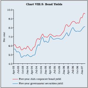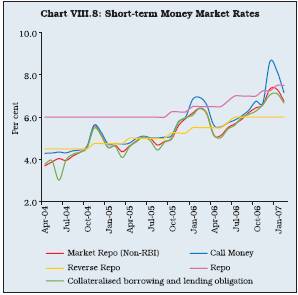 8.29 The integration of the credit market with other money market segments has become more pronounced in recent years. Sustained credit demand has led to higher demand for funds, exerting some pressure on liquidity. This was reflected in the decline in banks’ investment in government securities and higher activity in all the money market segments such as inter-bank call money, collateralised borrowing and lending obligation (CBLO) and market repo rates. Total volume in these three markets increased from Rs.16,132 crore in March 2005 to Rs.35,024 crore in March 2006 and further to Rs.38,484 crore in February 2007. Banks also resorted to increased issuances in the CDs market to meet their liquidity requirements. Outstanding CDs increased from Rs.12,078 crore in March 2005 to Rs.43,568 crore in March 2006 and further to Rs.77,971 crore by March 2, 2007.