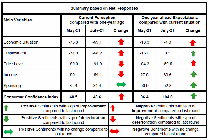 II. Driven by substantial improvements in the outlook for general economic situation and employment scenario after the waning of the second wave of the COVID-19 pandemic, the future expectations index (FEI) returned to optimistic territory; respondents placed higher confidence on household income going forward (Table 1 and 2).