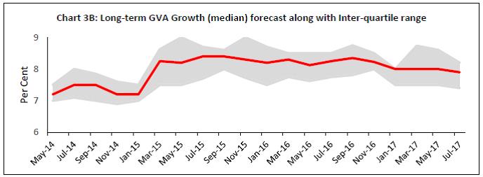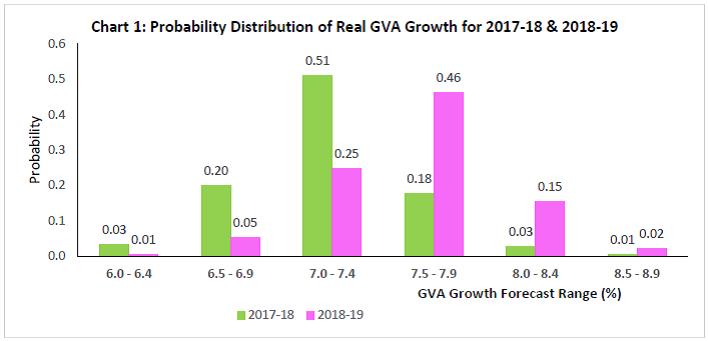 | | Key Macroeconomic Indicators | Quarterly Forecasts | | Q4: 2017-18 | Q1: 2018-19 | | Mean | Median | Max | Min | Mean | Median | Max | Min | | 1 | GDP at constant (2011-12) prices: Annual Growth (per cent) | 7.7 | 7.7 | 8.7 | 6.9 | 7.7 | 7.6 | 8.4 | 7.2 | | 2 | GVA at constant (2011-12) prices: Annual Growth (per cent) | 7.4 | 7.5 | 7.9 | 6.3 | 7.5 | 7.5 | 7.8 | 7.1 | | a | Agriculture & Allied Activities (growth rate in per cent) | 3.5 | 3.5 | 6.0 | 1.9 | 3.0 | 3.0 | 3.5 | 2.4 | | b | Industry (growth rate in per cent) | 7.7 | 7.7 | 9.9 | 4.1 | 7.2 | 7.5 | 8.8 | 4.9 | | c | Services (growth rate in per cent) | 8.4 | 8.5 | 9.4 | 7.3 | 8.6 | 8.6 | 9.1 | 7.9 | | 3 | PFCE at current prices: Y-on-Y Growth (per cent) | 12.8 | 12.5 | 16.2 | 11.0 | 12.5 | 12.5 | 14.5 | 10.1 | | 4 | GFCF Rate (per cent of GDP at current market prices) | 28.1 | 28.5 | 31.9 | 24.9 | 28.6 | 28.0 | 31.0 | 26.9 | | 5 | IIP (2011-12=100): Quarterly Average Growth (per cent) | 4.5 | 4.1 | 6.8 | 1.8 | 4.6 | 4.8 | 6.5 | 2.5 | | 6 | Merchandise Exports - BoP basis (in US$ bn.) | 78.6 | 79.3 | 84.8 | 67.5 | 77.6 | 77.3 | 83.2 | 73.6 | | 7 | Merchandise Imports - BoP basis (in US$ bn.) | 108.7 | 107.9 | 119.8 | 91.5 | 114.0 | 111.1 | 128.9 | 105.5 | | 8 | Rupee - US_Dollar Exchange rate (RBI reference rate) (end-period) | 65.53 | 65.45 | 68.00 | 64.00 | 65.54 | 65.50 | 67.00 | 63.93 | | 9 | Crude Oil (Indian basket) price (US $ per barrel) (end-period) | 50.71 | 50.00 | 60.00 | 41.80 | 51.68 | 51.79 | 60.00 | 43.00 | | 10 | Repo Rate (end-period) | 5.99 | 6.00 | 6.50 | 5.75 | 5.98 | 6.00 | 6.50 | 5.75 | | 11 | Cash Reserve Ratio (end-period) | 4.00 | 4.00 | 4.00 | 4.00 | 4.00 | 4.00 | 4.00 | 4.00 |