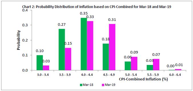 | Table A.7: Mean probabilities attached to possible outcomes of CPI (Combined) inflation | | Inflation Range | Forecasts for March 2018 | Forecasts for March 2019 | | 8.0 per cent or above | 0.00 | 0.00 | | 7.5 to 7.9 per cent | 0.00 | 0.00 | | 7.0 to 7.4 per cent | 0.00 | 0.00 | | 6.5 to 6.9 per cent | 0.00 | 0.00 | | 6.0 to 6.4 per cent | 0.00 | 0.01 | | 5.5 to 5.9 per cent | 0.03 | 0.07 | | 5.0 to 5.4 per cent | 0.06 | 0.09 | | 4.5 to 4.9 per cent | 0.18 | 0.31 | | 4.0 to 4.4 per cent | 0.35 | 0.33 | | 3.5 to 3.9 per cent | 0.27 | 0.15 | | 3.0 to 3.4 per cent | 0.10 | 0.03 | | 2.5 to 2.9 per cent | 0.01 | 0.01 | | 2.0 to 2.4 per cent | 0.00 | 0.01 | | 1.5 to 1.9 per cent | 0.00 | 0.00 | | 1.0 to 1.4 per cent | 0.00 | 0.00 | | 0.5 to 0.9 per cent | 0.00 | 0.00 | | 0 to 0.4 per cent | 0.00 | 0.00 | | Below 0 per cent | 0.00 | 0.00 |