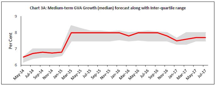 | Table A.3: Quarterly Forecasts from Q1:2017-18 to Q1:2018-19 | | | Key Macroeconomic Indicators | Quarterly Forecasts | | Q1: 2017-18 | Q2: 2017-18 | Q3: 2017-18 | | Mean | Median | Max | Min | Mean | Median | Max | Min | Mean | Median | Max | Min | | 1 | GDP at constant (2011-12) prices: Annual Growth (per cent) | 7.0 | 6.9 | 8.1 | 6.0 | 7.3 | 7.2 | 7.8 | 6.7 | 7.5 | 7.5 | 7.8 | 7.1 | | 2 | GVA at constant (2011-12) prices: Annual Growth (per cent) | 6.8 | 6.8 | 7.6 | 6.0 | 7.2 | 7.2 | 8.3 | 6.3 | 7.3 | 7.3 | 7.9 | 6.9 | | a | Agriculture & Allied Activities (growth rate in per cent) | 4.0 | 3.8 | 5.8 | 2.6 | 3.8 | 3.5 | 6.9 | 2.0 | 3.5 | 3.5 | 5.9 | 1.6 | | b | Industry (growth rate in per cent) | 6.2 | 6.1 | 8.3 | 5.0 | 7.3 | 7.0 | 9.0 | 6.0 | 7.5 | 7.6 | 9.2 | 5.7 | | c | Services (growth rate in per cent) | 7.8 | 8.0 | 8.9 | 6.1 | 7.9 | 8.2 | 9.8 | 6.1 | 8.5 | 8.5 | 10.1 | 7.1 | | 3 | PFCE at current prices: Y-on-Y Growth (per cent) | 11.9 | 11.8 | 13.5 | 10.6 | 11.9 | 11.7 | 13.6 | 10.7 | 12.4 | 12.0 | 15.3 | 11.0 | | 4 | GFCF Rate (per cent of GDP at current market prices) | 28.5 | 28.3 | 33.9 | 26.5 | 28.2 | 28.0 | 32.5 | 25.8 | 27.7 | 27.0 | 30.5 | 25.8 | | 5 | IIP (2011-12=100): Quarterly Average Growth (per cent) | 2.5 | 2.4 | 3.6 | 1.7 | 3.2 | 3.3 | 4.7 | 1.0 | 3.9 | 3.5 | 6.0 | 1.6 | | 6 | Merchandise Exports - BoP basis (in US$ bn.) | 73.2 | 73.7 | 77.7 | 68.5 | 73.1 | 73.1 | 78.1 | 66.0 | 74.0 | 73.2 | 79.1 | 66.9 | | 7 | Merchandise Imports - BoP basis (in US$ bn.) | 110.2 | 112.0 | 121.0 | 100.7 | 103.9 | 104.4 | 115.0 | 89.4 | 107.2 | 108.1 | 117.3 | 90.0 | | 8 | Rupee - US_Dollar Exchange rate (RBI reference rate) (end-period) | 64.73 | 64.74 | 64.84 | 64.50 | 64.98 | 64.82 | 67.80 | 63.15 | 65.40 | 65.25 | 68.60 | 63.14 | | 9 | Crude Oil (Indian basket) price (US $ per barrel) (end-period) | 46.72 | 46.72 | 46.72 | 46.72 | 50.22 | 49.18 | 57.00 | 46.00 | 50.71 | 50.00 | 60.00 | 43.58 | | 10 | Repo Rate (end-period) | 6.25 | 6.25 | 6.25 | 6.25 | 6.08 | 6.00 | 6.25 | 6.00 | 6.03 | 6.00 | 6.25 | 5.75 | | 11 | Cash Reserve Ratio (end-period) | 4.00 | 4.00 | 4.00 | 4.00 | 4.00 | 4.00 | 4.00 | 4.00 | 4.00 | 4.00 | 4.00 | 4.00 |