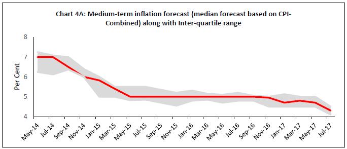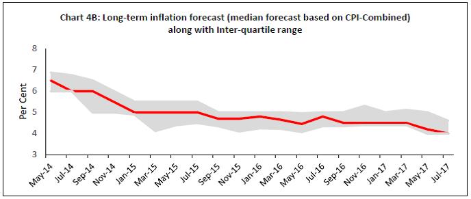 | Table A.4: Forecasts of CPI-Combined Inflation | | (per cent) | | | CPI Combined Headline | Core CPI Combined (excluding ‘Food & Beverages’, 'Pan, Tobacco & Intoxicants' and ‘Fuel & Light’) | | Mean | Median | Max | Min | Mean | Median | Max | Min | | Q2:2017-18 | 2.6 | 2.5 | 4.0 | 1.6 | 4.1 | 4.1 | 4.7 | 3.5 | | Q3:2017-18 | 3.7 | 3.7 | 4.9 | 2.2 | 4.5 | 4.5 | 7.0 | 2.9 | | Q4:2017-18 | 4.2 | 4.3 | 5.5 | 2.4 | 4.5 | 4.8 | 6.5 | 2.9 | | Q1:2018-19 | 4.6 | 4.6 | 5.4 | 2.5 | 4.7 | 4.6 | 6.7 | 3.3 |