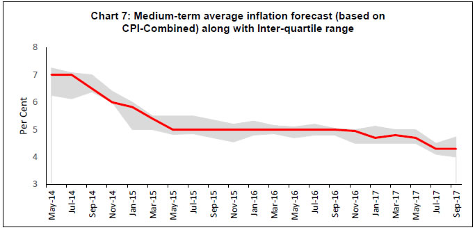 Professional forecasters have moderated their growth expectation for 2017-18 and 2018-19 in view of tempered assessment of private consumption demand and industrial growth. Nevertheless, they expect growth consolidation with higher saving and investment rate in 2018-19. Headline consumer price inflation is expected to increase to 5.0 per cent in Q1: 2018-19. On the external front, they anticipate improvement in foreign trade in the current year as well as in the next year. The Reserve Bank has been conducting the Survey of Professional Forecasters (SPF) since September 2007. Thirty panelists participated in the 48th round of the survey conducted during September 20172. The survey results are summarised in terms of their median forecasts and consolidated in Annexes 1-8, along with quarterly paths for key variables. Highlights: 1. Output • Real gross domestic product (GDP) and real gross value added (GVA) are likely to grow by 6.8 and 6.6 per cent, respectively, in 2017-18 and at 7.4 per cent each in 2018-19 (Table 1). • Expectations of both saving and investment rates in 2017-18 have moderated, but the both are anticipated to improve in the next year. | Table 1: Median Forecast of Growth in Real GDP, GVA and Components | | (in per cent) | | | 2017-18 | 2018-19 | | Real GDP Growth | 6.8 (-0.6) | 7.4 (-0.4) | | Real GVA Growth | 6.6 (-0.6) | 7.4 (-0.2) | | a. Agriculture and Allied Activities | 3.2 (-0.3) | 3.0 (0.0) | | b. Industry | 4.8 (-2.4) | 7.0 (-0.6) | | c. Services | 8.1 (-0.2) | 8.7 (-0.1) | Private Final Consumption Expenditure (nominal) (growth rate in per cent) | 11.0 (-1.5) | 12.7 (+0.1) | Gross Saving Rate [per cent of gross national deposable income (GNDI)] | 31.2 (-0.8) | 32.3 (0.0) | Gross Fixed Capital Formation Rate (per cent of GDP) | 26.5 (-1.5) | 27.6 (-1.4) | | Note: In all the tables, the figures in parentheses indicate the extent of revision in median forecasts (percentage points) relative to the previous SPF round. | • The summary probability distribution of forecasts has shifted marginally lower when compared with the previous survey round; forecasters have assigned maximum probability to GVA growth being in the range 6.5-6.9 per cent (Chart 1). • For 2018-19, forecasters assigned maximum probability to GVA growth in the range 7.0-7.4 per cent, with a flatter probability distribution than in the previous round (Chart 2). 2. Inflation • Headline consumer price index (CPI) inflation is expected to gradually increase from current levels to 5.0 per cent in Q1:2018-19 (Table 2). • Core inflation (i.e., CPI excluding food and beverages, pan, tobacco and intoxicants, and fuel and light), which is currently higher than headline inflation, is also expected to be increase by 60 basis points to 4.9 per cent in Q2:2018-19. | Table 2: Median Forecast of Quarterly Inflation | | (in per cent) | | | Q2:17-18 | Q3:17-18 | Q4:17-18 | Q1:18-19 | Q2:18-19 | | CPI - Headline | 3.1 (+0.6) | 4.1 (+0.4) | 4.5 (+0.2) | 5.0 (+0.4) | 4.5 | | CPI excluding food & beverages, pan, tobacco & intoxicants and fuel & light | 4.3 (+0.2) | 4.6 (+0.1) | 4.8 (0.0) | 4.9 (+0.3) | 4.9 | | WPI – All Commodities | 2.8 (+0.7) | 3.2 (+1.0) | 2.8 (+0.6) | 3.4 (+0.9) | 3.3 | | WPI - Non-food Manufactured Products | 2.5 (0.0) | 2.5 (+0.1) | 2.5 (+0.4) | 2.7 (+0.5) | 2.8 | • Forecasters assigned highest probability to CPI inflation being in the range 4.0-4.4 per cent in March 2018 and the summarised probability distribution has marginally tilted up when compared with the previous survey round (Chart 3). • For March 2019, forecasters assigned the highest probability to CPI inflation being in the range 4.0-4.4 per cent (Chart 4). 3. External Sector • There is greater optimism around the growth of both exports and imports (in US dollar terms), shedding the sluggishness of recent years (Table 3). • Forecasters expect higher import growth in 2017-18 and 2018-19 and consequently, a wider current account deficit (CAD) in these years. | Table 3: Median Forecast of Select External Sector Variables | | | 2017-18 | 2018-19 | Merchandise Exports – in US $ terms (annual growth in per cent) | 6.5 (-1.0) | 7.9 (+0.3) | Merchandise Imports– in US $ terms (annual growth in per cent) | 11.5 (+2.5) | 9.5 (+1.5) | Current Account Deficit (Ratio to GDP at current market price, in per cent) | 1.5 (+0.3) | 1.8 (+0.4) | 4. Medium-term and Long-term Forecasts • Real GVA growth is expected to be around 7.5 per cent both in the medium-term (five-year average) and in the long-term (ten-year average), a moderation of 20 basis points (bps) and 40 bps, respectively, from the previous survey round (Charts 5 and 6). • CPI-headline inflation is expected to be around 4.3 and 4.1 per cent in the medium-term and the long-term, respectively (Chart 7 and 8). The Reserve Bank thanks the following institutions for their participation in this round of the Survey of Professional Forecasters (SPF): Debopam Chaudhuri, Piramal Enterprises Limited; ICICI Securities Primary Dealership; Madan Sabnavis, CARE RATINGS; Upasna Bhardwaj, Kotak Mahindra Bank; Sameer Narang, Indranil Pan, IDFC Bank; Shailesh Kejariwal, B&K Securities India Pvt Ltd; Deepali Bhargava, Credit Suisse; CRISIL Limited; Gaurav Kapur, IndusInd Bank Ltd.; and Nikhil Gupta, Motilal Oswal. The Bank also acknowledges the contribution of 20 others SPF panelists, who preferred to remain anonymous, to the survey. | | Annex 1: Annual Forecasts for 2017-18 | | | Key Macroeconomic Indicators | Annual Forecasts for 2017-18 | | Mean | Median | Max | Min | 1st quartile | 3rd quartile | | 1 | GDP at constant (2011-12) prices: Annual Growth (per cent) | 6.8 | 6.8 | 7.2 | 6.2 | 6.6 | 7.0 | | 2 | GVA at basic prices at constant (2011-12) prices: Annual Growth rate (per cent) | 6.6 | 6.6 | 7.1 | 6.0 | 6.5 | 6.8 | | a | Agriculture & Allied Activities (growth rate in per cent) | 3.2 | 3.2 | 4.1 | 2.1 | 3.0 | 3.6 | | b | Industry (growth rate in per cent) | 4.8 | 4.8 | 6.3 | 3.4 