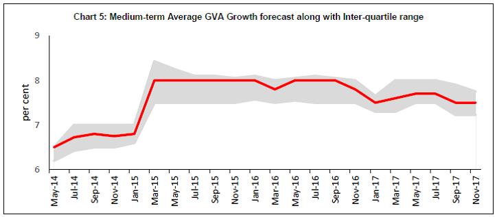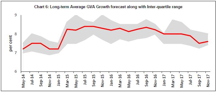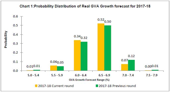• The summary probability distribution of GVA growth forecasts for 2017-18 is more positively skewed than in previous survey rounds: forecasters have assigned maximum probability to growth being in the range 6.5-6.9 per cent (Chart 1).