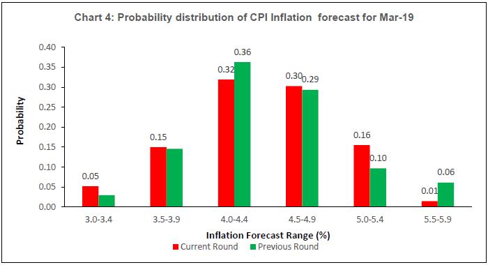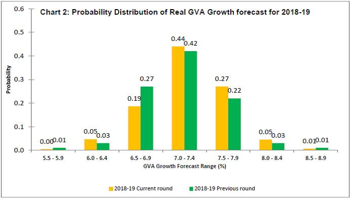 • For 2018-19, forecasters have assigned maximum probability to GVA growth in the range 7.0-7.4 per cent, with the distribution having shifted marginally to the right as compared with the previous round of the survey (Chart 2).