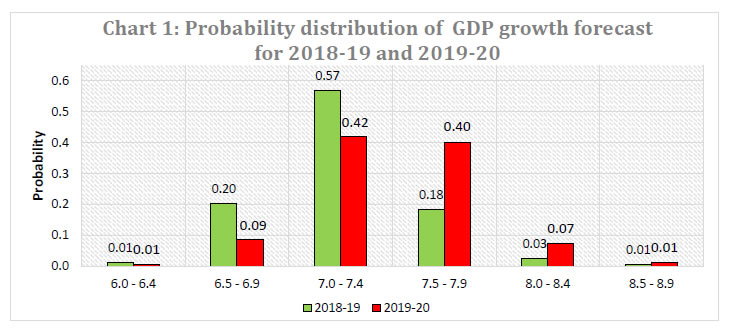 | Annex 6: Mean probabilities attached to possible outcomes of Real GDP growth | | Growth Range | Forecasts for 2018-19 | Forecasts for 2019-20 | | 10.0 per cent or more | 0.00 | 0.00 | | 9.5 to 9.9 per cent | 0.00 | 0.00 | | 9.0 to 9.4 per cent | 0.00 | 0.00 | | 8.5 to 8.9 per cent | 0.01 | 0.01 | | 8.0 to 8.4 per cent | 0.03 | 0.07 | | 7.5 to 7.9 per cent | 0.18 | 0.40 | | 7.0 to 7.4 per cent | 0.57 | 0.42 | | 6.5 to 6.9 per cent | 0.20 | 0.09 | | 6.0 to 6.4 per cent | 0.01 | 0.01 | | 5.5 to 5.9 per cent | 0.00 | 0.00 | | 5.0 to 5.4 per cent | 0.00 | 0.00 | | 4.5 to 4.9 per cent | 0.00 | 0.00 | | 4.0 to 4.4 per cent | 0.00 | 0.00 | | 3.5 to 3.9 per cent | 0.00 | 0.00 | | 3.0 to 3.4 per cent | 0.00 | 0.00 | | 2.5 to 2.9 per cent | 0.00 | 0.00 | | 2.0 to 2.4 per cent | 0.00 | 0.00 | | Below 2.0 per cent | 0.00 | 0.00 |