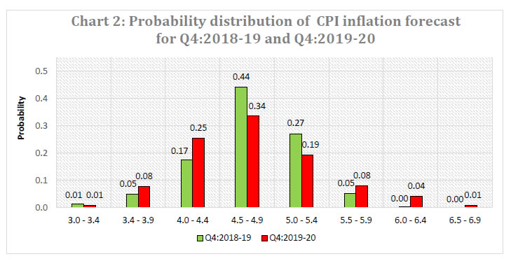 | Annex 8: Mean probabilities attached to possible outcomes of CPI (Combined) inflation | | Inflation Range | Forecasts for Q4:2018-19 | Forecasts for Q4:2019-20 | | 8.0 per cent or above | 0.00 | 0.00 | | 7.5 to 7.9 per cent | 0.00 | 0.00 | | 7.0 to 7.4 per cent | 0.00 | 0.00 | | 6.5 to 6.9 per cent | 0.00 | 0.01 | | 6.0 to 6.4 per cent | 0.00 | 0.04 | | 5.5 to 5.9 per cent | 0.05 | 0.08 | | 5.0 to 5.4 per cent | 0.27 | 0.19 | | 4.5 to 4.9 per cent | 0.44 | 0.34 | | 4.0 to 4.4 per cent | 0.17 | 0.25 | | 3.5 to 3.9 per cent | 0.05 | 0.08 | | 3.0 to 3.4 per cent | 0.01 | 0.01 | | 2.5 to 2.9 per cent | 0.00 | 0.00 | | 2.0 to 2.4 per cent | 0.00 | 0.00 | | 1.5 to 1.9 per cent | 0.00 | 0.00 | | 1.0 to 1.4 per cent | 0.00 | 0.00 | | 0.5 to 0.9 per cent | 0.00 | 0.00 | | 0 to 0.4 per cent | 0.00 | 0.00 | | Below 0 per cent | 0.00 | 0.00 | | Note: CPI: Consumer Price Index; GDP: Gross Domestic Products; GNDI: Gross National Disposable Income; GVA: Gross Value Added; IIP: Index of Industrial Production; WPI: Wholesale Price Index. | |