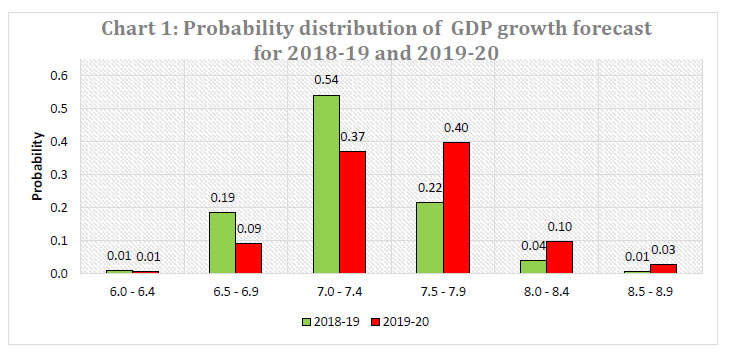 Growth is expected to firm up in 2018-19 and 2019-20 on the back of higher private consumption and investment. Consumer price inflation is expected to remain above 4.0 per cent from Q2:2018-19 to Q4:2018-19. The Reserve Bank has been conducting the Survey of Professional Forecasters (SPF) since September 2007. Twenty-five panellists participated in the 53rd round of the survey conducted during July 20182. The survey results are summarised in terms of their median forecasts and consolidated in Annexes 1-8, along with quarterly paths for key variables. Highlights: 1. Output • Real gross domestic product (GDP) is likely to grow at 7.4 per cent in 2018-19 ― up from 6.7 per cent in 2017-18 ― and is expected to accelerate further i.e., by 20 basis points (bps) in 2019-20 on the back of support from private consumption and investment (Table 1). • The investment rate, proxied by gross fixed capital formation, is expected to improve in 2018-19 and further in 2019-20, commensurate with an upturn in the saving rate. • Real gross value added (GVA) is expected to grow by 7.2 per cent in 2018-19 and by 7.4 per cent in 2019-20, supported by activity in the industrial and services sectors. | Table 1: Median Forecast of Growth in Real GDP, GVA and Components | | (in per cent) | | | 2018-19 | 2019-20 | | Real GDP Growth | 7.4 (0.0) | 7.6 (0.0) | Private Final Consumption Expenditure (nominal) (growth rate in per cent) | 11.6 (+0.6) | 11.8 (+0.5) | Gross Fixed Capital Formation Rate (per cent of GDP) | 29.0 (0.0) | 29.5 (+0.3) | | Real GVA Growth | 7.2 (+0.1) | 7.4 (0.0) | | a. Agriculture and Allied Activities | 3.4 (+0.4) | 3.0 (0.0) | | b. Industry | 6.9 (+0.1) | 7.0 (+0.2) | | c. Services | 8.2 (-0.1) | 8.6 (0.0) | Gross Saving Rate [per cent of gross national deposable income (GNDI)] | 30.0 (0.0) | 30.5 (0.0) | | Note: In all the tables, the figures in parentheses indicate the extent of revision in median forecasts (percentage points) relative to the previous SPF round. | • Forecasters have assigned the maximum probability to GDP growth being in the range of 7.0-7.4 per cent in 2018-19 and 7.5-7.9 per cent in 2019-20 (Chart 1). 2. Inflation • Headline consumer price index (CPI) inflation is likely to remain above 4.0 per cent till Q1:2019-20. • Core inflation (i.e., CPI excluding food and beverages, pan, tobacco and intoxicants, and fuel and light) is likely to remain above 5.0 per cent during 2018-19. | Table 2: Median Forecast of Quarterly Inflation | | (in per cent) | | | Q2:18-19 | Q3:18-19 | Q4:18-19 | Q1:19-20 | | CPI Headline | 4.7 (-0.2) | 4.3 (-0.1) | 4.8 (+0.2) | 5.1 | | CPI excluding food & beverages, pan, tobacco & intoxicants and fuel & light | 6.1 (+0.2) | 5.6 (+0.1) | 5.3 (+0.1) | 4.9 | | WPI All Commodities | 5.1 (+0.8) | 4.3 (+0.7) | 4.2 (+1.0) | 4.0 | | WPI Non-food Manufactured Products | 4.9 (+0.9) | 4.5 (+1.1) | 4.0 (+1.6) | 2.6 | • Forecasters have assigned the highest probability to CPI inflation being in the range 4.5-4.9 per cent in Q4:2018-19 as well as in Q4:2019-20 (Chart 2). 3. External Sector • The forecast of growth in merchandise exports and merchandise imports during 2018-19 have been revised up significantly to 9.8 per cent and 13.0 per cent, respectively, but some deceleration is expected in 2019-20 (Table 3). • The current account deficit (CAD) is expected to remain at around 2.5 per cent of GDP in 2018-19 and 2019-20. • The Indian rupee is likely to remain stable against the US dollar till Q4:2018-19 (Annex 3). | Table 3: Median Forecast of Select External Sector Variables | | | 2018-19 | 2019-20 | Merchandise Exports – in US $ terms (annual growth in per cent) | 9.8 (+1.7) | 8.4 (0.0) | Merchandise Imports– in US $ terms (annual growth in per cent) | 13.0 (+0.5) | 8.6 (+0.1) | Current Account Deficit (Ratio to GDP at current market price, in per cent) | 2.5 (+0.1) | 2.5 (+0.1) | The Reserve Bank thanks the following institutions for their participation in this round of the Survey of Professional Forecasters (SPF): Aditi Nayar, ICRA Limited; Anubhuti Sahay, Standard Chartered Bank; CRISIL Ltd; Debopam Chaudhuri, Piramal Enterprises Limited; Gaurav Kapur, IndusInd Bank Ltd.; ICICI Securities PD; Indranil Pan, IDFC Bank Ltd.; Nikhil Gupta, Motilal Oswal; Pinaki M. Mukherjee, Maruti Suzuki; Sameer Narang, Bank of Baroda; Shailesh Kejariwal, B&K Securities India Pvt Ltd; and Siddharth V Kothari, Sunidhi Securities & Finance Ltd. The Bank also acknowledges the contribution of 13 others SPF panellists, who prefer to remain anonymous. | | Annex 1: Annual Forecasts for 2018-19 | | Key Macroeconomic Indicators | Annual Forecasts for 2018-19 | | Mean | Median | Max | Min | 1st quartile | 3rd quartile | | 1 | GDP at constant (2011-12) prices: Annual Growth (per cent) | 7.3 | 7.4 | 7.8 | 6.9 | 7.2 | 7.5 | | 2 | Private Final Consumption Expenditure (PFCE) at current prices: Annual Growth (per cent) | 11.4 | 11.6 | 12.3 | 10.3 | 10.7 | 12.0 | | 3 | Gross Fixed Capital Formation (GFCF) Rate (per cent of GDP at current market prices) | 28.9 | 29.0 | 30.0 | 26.5 | 28.9 | 29.4 | | 4 | GVA at basic prices at constant (2011-12) prices: Annual Growth rate (per cent) | 7.2 | 7.2 | 7.7 | 6.7 | 7.0 | 7.3 | | a | Agriculture & Allied Activities (growth rate in per cent) | 3.5 | 3.4 | 4.4 | 2.8 | 3.0 | 4.0 | | b | Industry (growth rate in per cent) | 7.0 | 6.9 | 8.1 | 4.9 | 6.4 | 7.6 | | c | Services (growth rate in per cent) | 8.2 | 8.2 | 9.1 | 7.3 | 7.8 | 8.4 | | 5 | Gross Saving Rate (per cent of Gross National Disposable Income) - at current prices | 29.7 | 30.0 | 32.1 | 27.7 | 28.7 | 30.1 | | 6 | Fiscal Deficit of Central Govt. (per cent of GDP at current market prices) | 3.4 | 3.3 | 3.7 | 3.2 | 3.3 | 3.5 | | 7 | Combined Gross Fiscal Deficit (per cent to GDP) | 6.1 | 6.1 | 6.6 | 5.7 | 6.0 | 6.3 | | 8 | Bank Credit - Scheduled commercial banks: Annual Growth (per cent) | 11.1 | 11.3 | 15.0 | 8.0 | 9.8 | 12.0 | | 9 | Yield on 10-Year G-Sec of Central Govt. (
