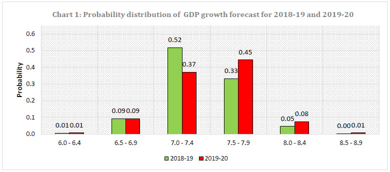 Growth is expected to firm up in 2018-19 and 2019-20 on the back of higher private consumption. Consumer price inflation is expected to remain above 4.0 per cent till Q2:2019-20. The Reserve Bank has been conducting the Survey of Professional Forecasters (SPF) since September 2007. Twenty-nine panellists participated in the 54th round of the survey conducted during September 20182. The survey results are summarised in terms of their median forecasts and consolidated in Annexes 1-7, along with quarterly paths for key variables. Highlights: 1. Output • Real gross domestic product (GDP) is likely to grow at 7.4 per cent in 2018-19 ― up from 6.7 per cent in 2017-18 ― and is expected to accelerate further by 10 basis points (bps) in 2019-20 on the back of support from private consumption (Table 1). • The investment rate, proxied by the ratio of gross fixed capital formation to GDP, is expected to improve in 2018-19 and 2019-20, commensurate with an upturn in the saving rate. • Real gross value added (GVA) is expected to grow by 7.2 per cent in 2018-19 and by 7.3 per cent in 2019-20, supported by activity in the industrial and services sectors. | Table 1: Median Forecast of Growth in Real GDP, GVA and Components | | (in per cent) | | | 2018-19 | 2019-20 | | Real GDP Growth | 7.4 (0.0) | 7.5 (-0.1) | Private Final Consumption Expenditure (nominal) (growth rate in per cent) | 12.4 (+0.8) | 12.4 (+0.6) | Gross Fixed Capital Formation Rate (per cent of GDP) | 28.8 (-0.2) | 29.1 (-0.4) | | Real GVA Growth | 7.2 (0.0) | 7.3 (-0.1) | | a. Agriculture and Allied Activities | 3.9 (+0.5) | 3.6 (+0.6) | | b. Industry | 7.7 (+0.8) | 7.2 (+0.2) | | c. Services | 7.9 (-0.3) | 8.4 (-0.2) | Gross Saving Rate [per cent of gross national deposable income (GNDI)] | 29.8 (-0.2) | 30.0 (-0.5) | | Note: In all the tables, the figures in parentheses indicate the extent of revision in median forecasts (percentage points) relative to the previous SPF round. | • Forecasters have assigned the maximum probability to GDP growth being in the range of 7.0-7.4 per cent in 2018-19 and 7.5-7.9 per cent in 2019-20 (Chart 1). 2. Inflation • Headline consumer price index (CPI) inflation is likely to remain above 4.0 per cent till Q2:2019-20. • Core inflation (i.e., CPI excluding food and beverages, pan, tobacco and intoxicants, and fuel and light) is likely to remain above 5.0 per cent during 2018-19 before edging down to 5.0 per cent in the first half of 2019-20. | Table 2: Median Forecast of Quarterly Inflation | | (in per cent) | | | Q2:18-19 | Q3:18-19 | Q4:18-19 | Q1:19-20 | Q2:19-20 | | CPI Headline | 4.1 (-0.6) | 4.1 (-0.2) | 4.5 (-0.3) | 5.0 (-0.1) | 5.1 | | CPI excluding food & beverages, pan, tobacco & intoxicants and fuel & light | 6.0 (-0.1) | 5.6 (0.0) | 5.3 (0.0) | 5.0 (+0.1) | 5.0 | | WPI All Commodities | 4.8 (-0.3) | 4.2 (-0.1) | 4.0 (-0.2) | 3.7 (-0.3) | 3.6 | | WPI Non-food Manufactured Products | 4.8 (-0.1) | 4.6 (+0.1) | 3.9 (-0.1) | 3.6 (+1.0) | 3.3 | • Forecasters have assigned the highest probability to CPI inflation being in the range 4.0-4.4 per cent in Q2:2018-19. • For Q3:2018-19, highest probability has been assigned to inflation being in the range of 3.5-4.4 per cent. • Forecasters have assigned the highest probability to CPI inflation being in the range 4.5- 4.9 per cent for Q4:2018-19. • Highest probability has been assigned to inflation being in the range of 4.5- 5.4 per during Q1:2019-20 (Chart 2). 3. External Sector • The forecast of growth in merchandise exports and merchandise imports during 2018-19 have been revised up to 10.4 per cent and 14.3 per cent, respectively, but some deceleration is expected in 2019-20 (Table 3). • The current account deficit (CAD) is expected at 2.7 per cent of GDP in 2018-19 and at 2.5 per cent of GDP in 2019-20. • The Indian rupee is likely to remain around ₹72 per US Dollar till Q4:2018-19 (Annex 3). | Table 3: Median Forecast of Select External Sector Variables | | | 2018-19 | 2019-20 | Merchandise Exports – in US $ terms (annual growth in per cent) | 10.4 (+0.6) | 9.7 (+1.3) | Merchandise Imports– in US $ terms (annual growth in per cent) | 14.3 (+1.3) | 8.4 (-0.2) | Current Account Deficit (Ratio to GDP at current market price, in per cent) | 2.7 (+0.2) | 2.5 (0.0) | The Reserve Bank thanks the following institutions for their participation in this round of the Survey of Professional Forecasters (SPF): Aditi Nayar, ICRA Limited; Anubhuti Sahay, Standard Chartered Bank; Debopam Chaudhuri, Piramal Enterprises Limited; Devendra Kumar Pant, India Ratings and Research; Dr Arun Singh, Dun & Bradstreet; Gaurav Kapur, IndusInd Bank Ltd.; ICICI Securities Primary Dealership; Indranil Pan, IDFC Bank Ltd.; Nikhil Gupta, Motilal Oswal; PHD Research Bureau; Sameer Narang, Bank of Baroda; Shailesh Kejariwal, B&K Securities India Pvt Ltd; Siddharth V Kothari, Sunidhi Securities & Finance Ltd; Sumedh Deorukhkar, BBVA and Upasna Bhardwaj, Kotak Mahindra Bank. The Bank also acknowledges the contribution of 14 others SPF panellists, who prefer to remain anonymous. | | Annex 1: Annual Forecasts for 2018-19 | | Key Macroeconomic Indicators | Annual Forecasts for 2018-19 | | Mean | Median | Max | Min | 1st quartile | 3rd quartile | | 1 | GDP at constant (2011-12) prices: Annual Growth (per cent) | 7.4 | 7.4 | 7.8 | 7.0 | 7.3 | 7.5 | | 2 | Private Final Consumption Expenditure (PFCE) at current prices: Annual Growth (per cent) | 12.3 | 12.4 | 13.3 | 10.3 | 12.0 | 12.8 | | 3 | Gross Fixed Capital Formation (GFCF) Rate (per cent of GDP at current market prices) | 28.5 | 28.8 | 29.5 | 26.5 | 28.1 | 29.0 | | 4 | GVA at basic prices at constant (2011-12) prices: Annual Growth rate (per cent) | 7.3 | 7.2 | 9.7 | 6.7 | 7.1 | 7.4 | | a | Agriculture & Allied Activities (growth rate in per cent) | 3.9 | 3.9 | 7.1 | 3.0 | 3.5 | 4.3 | | b | Industry (growth rate in per cent) | 7.7 | 7.7 | 10.9 | 6.3 | 7.1 | 8.0 | | c | Services (growth rate in per cent) | 7
