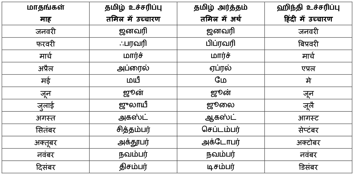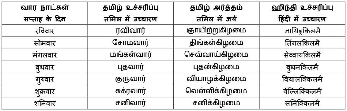 | शब्द / उच्चारण / शब्दार्थ வார்த்தை / உச்சரிப்பு / பொருள் | ||