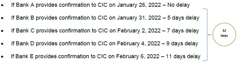 Explanation: The delay of six days shall be apportioned by the CIs/CICs on weighted average of the extent of delay by each CIs/CICs. In the above case, the overall delay is 6 days and therefore the complainant shall be entitled for total compensation of ₹600. This needs to be apportioned between all the defaulting banks (in this case Bank B, C, D and E). Cumulatively, the delay of all the defaulting banks put together is 32 days (5+7+9+11 days). Therefore, the compensation amount of ₹600 shall be apportioned on weighted average of the delay by each CIs in relation to the overall delay of 32 days in this case.