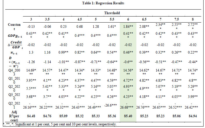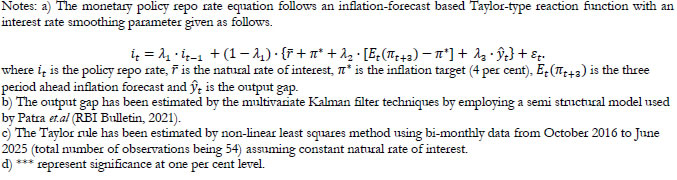 Annex 2: MPC Resolution: Mapping Growth and Inflation Objectives The objective of price stability is typically the primary objective of monetary policy under the flexible inflation targeting (FIT) framework but it is not designed to be achieved at an unacceptable cost in terms of foregone growth (sacrifice ratio). The theory underpinning the practice of contemporary monetary policy states that optimal policy involves an objective function which maximises social welfare by minimising the variability of inflation around an inflation target and the variability of output around its potential level. Today’s FIT frameworks across the globe embody these trade-offs. Under the current monetary policy framework, the relative emphasis given to growth and inflation over the period determines the decisions on the direction of key policy rate (repo).34 The Monetary Policy Committee (MPC) since its inception in October 2016 had to grapple with several formidable challenges namely, – demonetisation; shocks to inflation from food and crude oil prices; growth slowdown; recurrent external shocks followed by crisis caused by COVID-19 pandemic, and Russia-Ukraine conflict. An analysis of the Monetary Policy Resolutions (published on the day of policy announcement) based on word-count of inflation and growth coverage/discussion in each resolution, supported by text-mining with results presented in a form of word cloud - reflects the relative importance of key words and phrases that dominated the policy resolution during the FIT period (Chart 1). Monetary policy is the art of balancing with a degree of judgement. The weight assigned to a particular objective - inflation or growth - depends on the assessment of risk that may impact the balanced growth path of the economy. Thus, the decisions taken by the MPC since 2016 are based on relative emphasis on inflation or growth. A text mining analyses of MPC resolutions since 2016 reveal a reduction in size, with improvement in readability in the FIT period (Chart 2). During the period from October to December 2016, inflation occupied more than 60 per cent of the growth-inflation discussions. By February 2017, however, inflation assumed centre stage with the discussions on inflation accounting close to 70 per cent of the total growth-inflation deliberations. Thereafter, during June and October 2017, the relative emphasis on growth increased, whereas from December 2017, inflation discussions started getting higher emphasis. With the onset of COVID-19 pandemic, the inflation took the centre stage while framing the monetary policy. However, the aftermath of pandemic shifted the MPC assessment towards growth aligned with policy repo rate. Thus, changes in growth-inflation dynamics in MPS resolution reflects the repo rate movements. Text-Mining practices presented in Chart 3 (a & b) shows that for full FIT period, policy focus was on inflation, though growth remained the priority only for COVID period. Annex 3: Estimation of Taylor Rule The central bank’s monetary policy reaction function can be frequently summarized by a Taylor rule (Taylor, 1993). This serves as a suitable guidepost in assessing the policy rate adjustments made by the MPC in response to the deviation of inflation from its target and objectives related to output. The weights assigned by the MPC to inflation forecast gap (deviation of three period ahead inflation forecast from the target), and output gap has been empirically estimated by using a Taylor rule specification with an interest rate smoothing parameter (RCF, 2021).35 The estimation has been carried out by considering the policy rate decisions in bimonthly meetings from October 2016 to June 2025. The estimation results suggest that the MPC have been cautious in its approach regarding dealing with shocks and have been very gradual in altering the policy rates as reflected by the estimated high interest smoothing parameter (lagged policy rate). Both the estimated implicit weights assigned to inflation forecast gap and output gap are found to be significant with higher importance given to inflation consistent with the mandate (Table 1). Eichergreen and Gupta, 2024 also find positive and significant coefficients on output gap and inflation in their estimation of policy reaction function when effective policy rate is included as a lagged variable. The estimated coefficient on lagged policy rates also indicated significant inertia. Separate estimation reveals that weight associated with realised inflation gap instead of inflation forecast gap is insignificant indicating the forward-looking nature of monetary policy. Monetary policy has been accommodative during March 2020 to April 2022 owing to contributions from pandemic induced large negative output gaps and the flexibility embedded in FIT which allowed the MPC to look through the deviation of inflation forecast from its target. Since May 2022, with gradual strengthening of aggregate demand conditions, the MPC has adopted a prudent approach in raising policy rates consistent with the inflation objective. In recent periods, the MPC has been more focussed on providing support to aggregate demand conditions with inflation forecast durably aligning with the target (Chart 1).