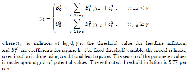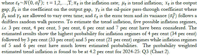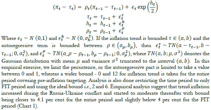 Annex 9: Trend Inflation Estimates for India Various approaches have been used to estimate trend inflation. The first approach involves estimating time-varying trend inflation followed from Chan et al., (2013) where trend inflation is restricted to lie within bounds. The error variance follows a driftless random walk process. The trend inflation also follows a random walk. The model is given as: Second approach uses the standard regime switching NKPC model with slight modification to incorporate time-varying impact of input costs by allowing the oil price pass-through rate to follow a regime-switching process (Behera and Patra, 2022). Specifically, the following model is estimated by using Bayesian method: In addition to these univariate measures, multivariate core trend (MCT) inflation is estimated by using the methodology proposed by Stock and Watson (2016). The model decomposes the CPI inflation into common trend, sector-specific trends, sector specific common shocks and transitory shocks to estimate the MCT trend as the sum of the common and the sector-specific trends weighted by the CPI Core weights. The estimated MCT trend inflation after reaching its peak at 7.3 per cent in April 2022 started easing steadily to around 3.5 per cent in recent months. Lastly, policy makers also monitor movement of the long-run inflation expectation of the economic agents as it provides credibility of monetary policy. Monetary policy is thought to be most effective when long-term inflation expectation remains stable. Recent literature uses the long-run inflation forecasts of economic agents to estimate the underlying relation between and trend inflation and inflation expectations and determine the trend path (Chan, Clark and Koop, 2018). Following the same methodology, trend inflation path has been estimated using the data from September 2016 to March 2025. The long-term inflation expectation has been measured by 5-year ahead and 10-year ahead inflation expectation based on the bimonthly survey conducted by the Reserve Bank. Empirical results suggest that trend inflation increased during the COVID pandemic and geo-political conflict in the black-sea region and started to moderate thereafter. References: Behera, H. K., and Patra, M. D. (2022). Measuring trend inflation in India. Journal of Asian Economics, 80, 101474. Cascaldi-Garcia, D., López-Salido, J.D. and Loria, F. (2022) Is Trend Inflation at Risk of Becoming Unanchored? The Role of Inflation Expectations, FEDS Notes. 2022-03-31. Board of Governors of the Federal Reserve System (U.S.). Chan, J.C.C., Koop, G. and Potter, S.M. (2013) A New Model of Trend Inflation, Journal of Business & Economic Statistics, 31(1), 94-106 Chan, J.C.C., Clarh, T.E. and Koop, G. (2018), ‘A New Model of Inflation, Trend Inflation, and Long-Run Inflation Expectations’, Journal of Money, Credit and Banking, Vol. 50(1), pp. 5-53. Garcia, J.A. and Poon, A. (2022) Inflation trends in Asia: implications for central banks, Oxford Economic Papers, 74(3), 671-700. Österholm, P. and Poon, A. (2022) Trend Inflation in Sweden, International Journal of Finance & Economics. Stock, J.H., Watson, M.W., (2016). Core inflation and trend inflation. The Review of Economics and Statistics 98 (4), 770-784. Annex 10: The Balassa-Samuelson (BS) Effect: An Estimation for India Productivity is the primary driving force for fostering growth in emerging market economies (EMEs). The Balassa-Samuelson hypothesis (1964) states that higher productivity growth in tradable sector relative to non-tradable sector leads to higher aggregate wage growth in the economy. Thus, BS hypothesis provides an explanation for higher inflation in EMEs compared to the advanced economies (AEs), as the former generally experience higher output and productivity growth as compared to the latter40. It has been argued that the real effective exchange rate should appreciate at the productivity differential between you and the rest of the world and a 4 per cent inflation target is consistent with 2 per cent average inflation in AEs and a 2 per cent productivity growth in India (Rajan 2014).41 Testing the following proposition theoretically, provides a plausible justification of India’s inflation target of 4% (+/- 2%) target Theory: From the real exchange rate (R) equation, R = E. (Pd/Pf), where E = nominal exchange rate; Pd = domestic price level; Pf = foreign price level, it can be shown that r = e + (pd – pf)….. (i), where r, e, pd and pf are respective growth rates of R, E, Pd and Pf. If the productivity differential between India and rest of the world is 2%, then by a corollary of the Balassa Samuelson hypothesis42, the real exchange rate of India should appreciate by 2%. If we plug this value in (i) and given that pf = 2%, i.e, 2 = e + (pd – 2). In this scenario, the only value of pd which would ensure that there is no change in the nominal exchange rate (i.e., e = 0) is 4. Therefore, a domestic inflation rate of 4 per cent is consistent with the Balassa-Samuelson proposition (and assumptions on productivity differential) while ensuring the stability of the nominal exchange rate. This argument is implicitly premised on the proposition that the purchasing power parity (PPP) theorem holds, because only then can the real exchange rate be expressed as in (i). This hypothesis has been tested empirically using panel data from countries while country-specific studies are relatively scarce (Ishaq et al, 2023; Ghosh et al, 2023). The average total factor productivity (TFP) growth for the inflation targeting EMEs, barring a few period of shocks, remained above that of Advanced Economies (AEs)43. India has witnessed consistently higher inflation over the years as compared with AEs, with inflation differential narrowing substantially after the implementation of flexible inflation targeting (FIT) in 2016. For India, the average TFP growth differential against AEs during 1995-2024 stood substantially higher at 1.83 perce