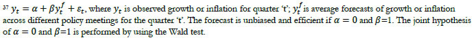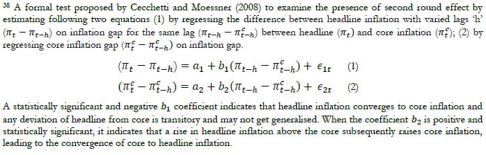 Annex 4: Inflation and Growth Projection Analysis The inflation forecast, which acts as the intermediate target for monetary policy under a FIT regime (King 1994; Svensson, 1997), embodies the consolidated information set available to the MPC at the time of its decision. As policy is guided by forecasts, the success of the FIT framework depends on the accuracy of inflation as well as growth forecasts. Since the FIT inception, a comparison of inflation forecasts vis-à-vis realised inflation suggests forecasts deviation on either side (Chart 1a). Similarly, there have been overestimation and underestimation of growth as well (Chart 1b). Forecast errors in India were the lowest in this cross-country comparison. Compared to the first review period, however, there has been an improvement in the forecasts possibly due to improvement in modelling (quarterly projection model - QPM 2.0)36, market intelligence and longer period data availability. In this regard, an evaluation of inflation forecasts in eight central banks shows a deterioration in forecasting performance during the pandemic period; the forecast errors were higher for longer horizons and for the advanced economies (RBI, 2023). A formal test of unbiasedness of the RBI’s forecasts performed by estimating two equations37 separately for inflation and GDP growth during the FIT period suggests that the forecasts are unbiased (Table 1). In other words, this corroborates the graphical presentation of forecasts vis-à-vis actuals that there is no systematic bias in forecasts. This, in turn, suggests that the use of the forecasts by the MPC does not result in any bias in policy making, ceteris paribus. Reference: RBI (2023). Inflation Forecast Accuracy Under High Volatility: Cross-Country Evidence. Box I.1 in the Monetary Policy Report, April. Annex 5: Convergence and Spillovers: Core versus Non-Core The results suggest that there exists a long-run equilibrium relationship between core and non-core prices. Further, the error correction term is significant and negative only in case of the non-core equation. It implies that non-core inflation converges to core inflation in long-run and the deviation from equilibrium gets corrected by around 3 quarters1 (Table 1). The large residual volatility of non-core inflation (compared to core inflation) indicates the transitory nature of the non-core inflationary shocks. In the short-run, however, a positive relationship from non-core inflation to core inflation is found to be statistically significant, even though its magnitude its low. This indicates that spillovers also do happen from non-core inflation to core inflation, if the supply shocks remain persistent, through increased costs as well as unanchored inflation expectations. References: Pesaran, M. H., Shin, Y., & Smith, R. J. (2001). Bounds testing approaches to the analysis of level relationships. Journal of applied econometrics, 16(3), 289-326. RBI (2021). Chapter 1: Flexible Inflation Targeting in India, Report of Currency and Finance. _____________________________________________________ 1 The error correction coefficient indicates nearly 12% of disequilibria gets corrected in a month. This implies that for full correction it takes 8-9 months (3 quarters). Annex 6: Headline and Core Inflation Convergence: Rolling Regression Estimates Volatile price changes dissipate when headline converges to core; but those price changes could potentially lead to second-round effects when core converges to headline (Cecchetti and Moessner, 2008; Behera and Ranjan, 2024)38. Rolling regression estimates of convergence, following Cecchetti and Moessner (2008) and using monthly data from January 2011 to April 2025 with a rolling window size of 60 months, show that headline reverts to core inflation and the speed of convergence has increased since November 2023 (Chart 1 a). On the other hand, the speed of convergence from core to headline inflation, which went up on account of supply disruptions and other supply shocks during the pandemic and Ukraine war, has started falling since November 2023 (Chart 1 b). References: Behera, H. and Ranjan, A. (2024). Food and Fuel Prices: Second Round Effects on Headline Inflation in India. RBI Bulletin, April. Cecchetti, S.G. and Moessner, R. (2008). Commodity Prices and Inflation Dynamics. BIS Quarterly Review, December.
