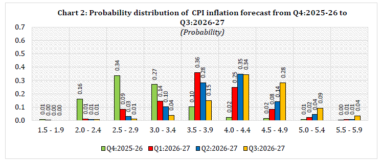 - Forecasters have assigned the highest probability to the headline CPI inflation lying in the range of 2.5-2.9 per cent in Q4:2025-26; and in the range of 3.5-3.9 per cent during Q1:2026-27 and 4.0-4.4 per cent during the subsequent two quarters of 2026-27 (Chart 2).